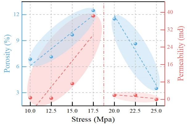 隨著應力的逐漸增加,孔隙度和滲透率的變化趨勢保持一致,均呈現出先上升后下降的特征(圖6)。10.0-17.5MPa,孔隙度從6.88%增大到12.48%,滲透率也相應地從0.77md增大到38.49md。此階段應力作用下煤體被壓裂,使孔裂隙的連通性顯著提升。在熱解過程中,孔裂隙內對流傳熱增強,使得孔隙不斷擴大以及合并,從而導致孔滲急劇增大。20.0-25.0MPa,孔隙度和滲透率顯著降低,分別從11.53%和1.87md減小到3.51%和0.01md。此階段,更高的應力約束使得煤體遭受更強烈的壓實作用,導致裂隙閉合,孔裂隙的連通性明顯減弱。盡管這增強了熱解過程中煤基質的傳熱效應,并在煤基質中形成了豐富的孔隙,但由于尺寸相對較小且連通性較差,最終導致孔隙度和滲透率呈下降趨勢。
