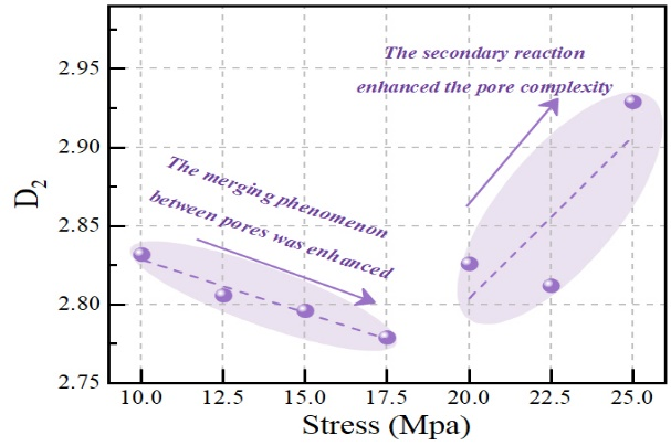 (1) 應力約束下孔隙結構的演化呈現明顯的階段性。10-17.5MPa,煤體逐漸被壓裂,孔裂隙相互連通,熱解時孔裂隙內流體對流傳熱增強,孔隙不斷擴大,孔滲隨之增大,分形維數減少。20-25MPa,煤體被壓實,裂隙閉合導致孔裂隙連通性變差,孔隙內對流傳熱弱化,基質傳熱增強導致基質上形成了新的獨立小孔隙,使得孔滲降低,分形維數增大。