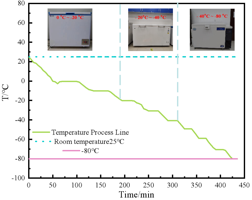 -20°C降至-40°C;最后,使用超低溫冰箱將樣品溫度從-40°C降至-80°C。使用XSL-D180LM2V0巡檢儀采集器監測樣品溫度變化,當樣品整體溫度達到目標溫度時開始測試。冷卻過程如圖2所示。