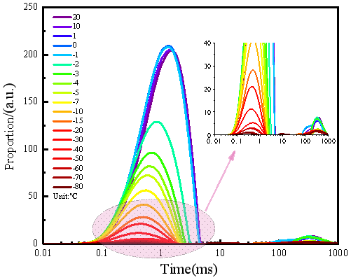 根據上述冷卻策略對樣品進行冷凍,并在20°C至-80°C范圍內測量核磁共振信號強度。每次NMR測試涉及以下參數:60 mm線圈、CPMG(Carr-Purcell-Meiboom-Gill)射頻序列、250 kHz采樣頻率、15倍模擬增益、3000個回波、0.15 ms回波時間和1000 ms等待時間。