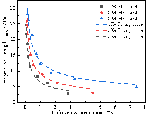 對極低溫度凍土中未凍水含量與抗壓強度之間的關系進行了擬合,樣品的抗壓強度及擬合曲線如圖6所示。土壤中未凍水含量直接影響凍土的強度。從水的分子熱力學角度來看,液態水分子始終呈現無序的布朗運動,其相應的動能與溫度相關。溫度越低,動能越小。在零度以上時,土壤中的水為液態水,其黏度極低,容易從縫隙中被擠出,由此產生的土壤強度較低。當土壤溫度低于水的冰點時,土壤中的水轉變為冰晶并逐漸形成冰體。隨著溫度的降低,土壤中的水達到冰點并形成小分子團,成為結晶中心。隨后,這些小分子團成長為稍大的聚集體,稱為晶核。最終,這些小聚集體結合生長,產生冰晶。冰晶在液態水膜與土壤顆粒之間形成,增加了土壤的凝聚力。隨著溫度的降低,未凍水含量減少,液態水膜變薄,潤滑作用減弱,摩擦力增大。根據試驗數據推測,隨著溫度的降低,幾乎所有未凍水都轉化為冰,抗壓強度達到最大值。溫度繼續降低時,抗壓強度保持不變。后續將開展相關研究以驗證這一推測。