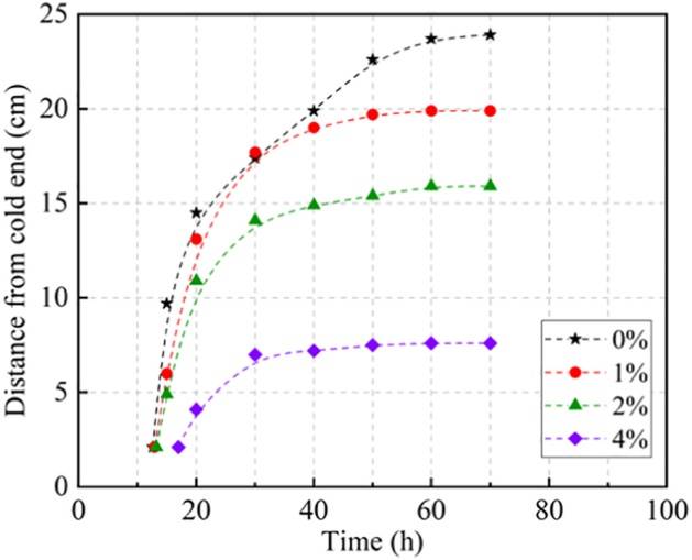 以前的研究表明,單向凍結期間的溫度分布在靠近冷端的部分是線性的,在非穩態的暖端附近是曲線線性的。因此,非穩態的凍結前沿的位置也是通過線性插值確定的,因為它在凍結的早期階段接近冷端。圖4說明了凍結前沿位置的演變,即與冷端的距離隨著時間發生推移??梢钥吹?,凍結前沿在凍結開始時移動得很快,然后在凍結過程結束時逐漸達到一個熱平衡狀態。在快速移動階段,由于鹽引起的冰點變低,鹽含量較高的樣品,其凍結前沿移動速度比鹽含量較低的樣品慢。在穩定階段,凍結前沿的最終位置取決于鹽含量,鹽含量較低的土壤樣品在更加遠離冷端的地方有一個凍結前沿。此外,鹽隨水向冷端遷移,在孔隙水凍結時被排斥在冰外。因此,鹽的濃度在凍結前沿附近增加,這進一步抑制了向上運動。