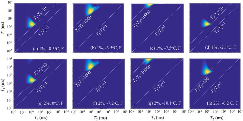 如圖5所示,選擇了四個溫度下兩種鹽含量的樣品得到的低場核磁T1-T2測試結果,以說明F-T期間T1-T2相關光譜的代表性階段以及溫度和鹽含量的影響。具體來說,挑選了四個溫度,如圖5所示。從每個樣品中選擇了一個低于冰點的溫度(例如,1%鹽含量的-3.5℃和2%鹽含量的-7.2℃),以便來分析溫度和鹽含量對水分子流動性的影響。T 1/T 2比率是一個說明分子流動性的特征參數。