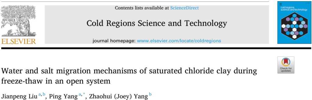 [1] Liu J, Yang P, Yang Z J. Water and salt migration mechanisms of saturated chloride clay during freeze-thaw in an open system[J]. Cold Regions Science and Technology, 2021, 186(8):103277.