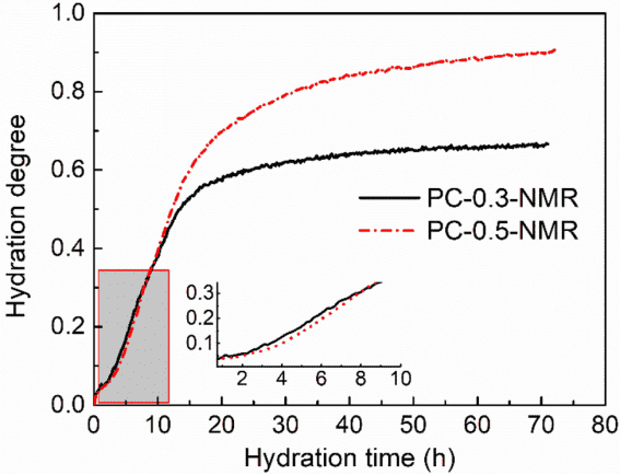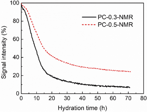 圖1顯示了3天內不同樣品PC-0.3-NMR和PC-0.5-NMR的水化過程低場核磁信號。水泥的水化過程也可以根據信號強度的變化率大致分為三個階段。在水化后的幾個小時內,水化產物分布在未水化的水泥表面,使整個水化過程變得緩慢,特別是PC-0.5-NMR的水化過程。然后,涂層破裂導致水化進入快速反應階段,最后水化速度逐漸減慢并穩定下來。