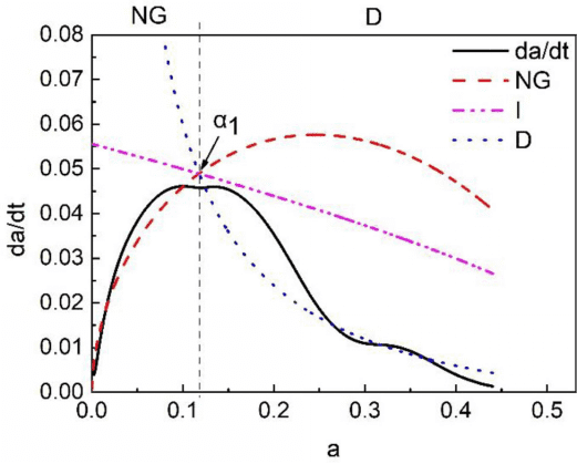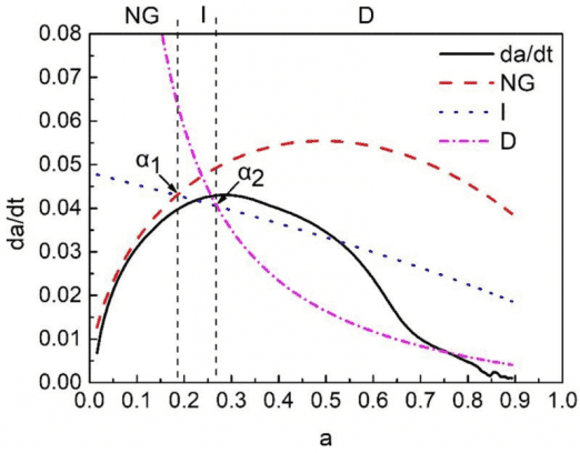 因此,C3S的水化反應首先由NG過程主導,然后變成D過程,是不經過I過程的。當水化程度在0-0.127時,C3S的水化主要為NG階段;在水化程度達到0.127后,水化反應主要為D階段。