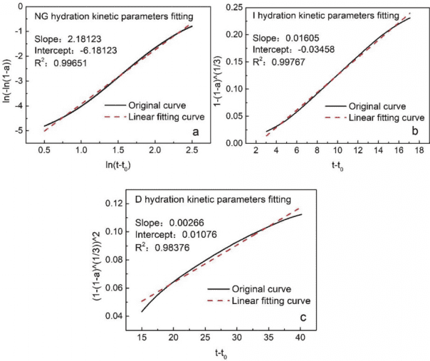 圖7顯示了通過低場核磁共振對C3S的NG-I-D水化階段進行分段模擬的結果。如圖7所示,NG、I和D的三條水化動力學曲線也相交于一點。