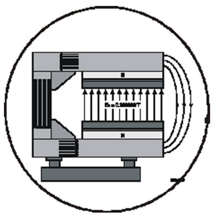 無源勻場是在磁極的內外表面貼小磁片或磁鋼片,通過小磁片或磁鋼片對局部磁力線的改變從而調整磁場均勻性,本實驗裝置中由于磁極間的均勻性較好,因此未采用無源勻場方式。下面實物圖中小磁片即是無源勻場方式勻場。